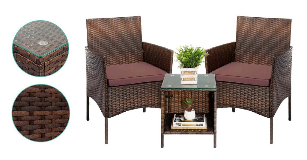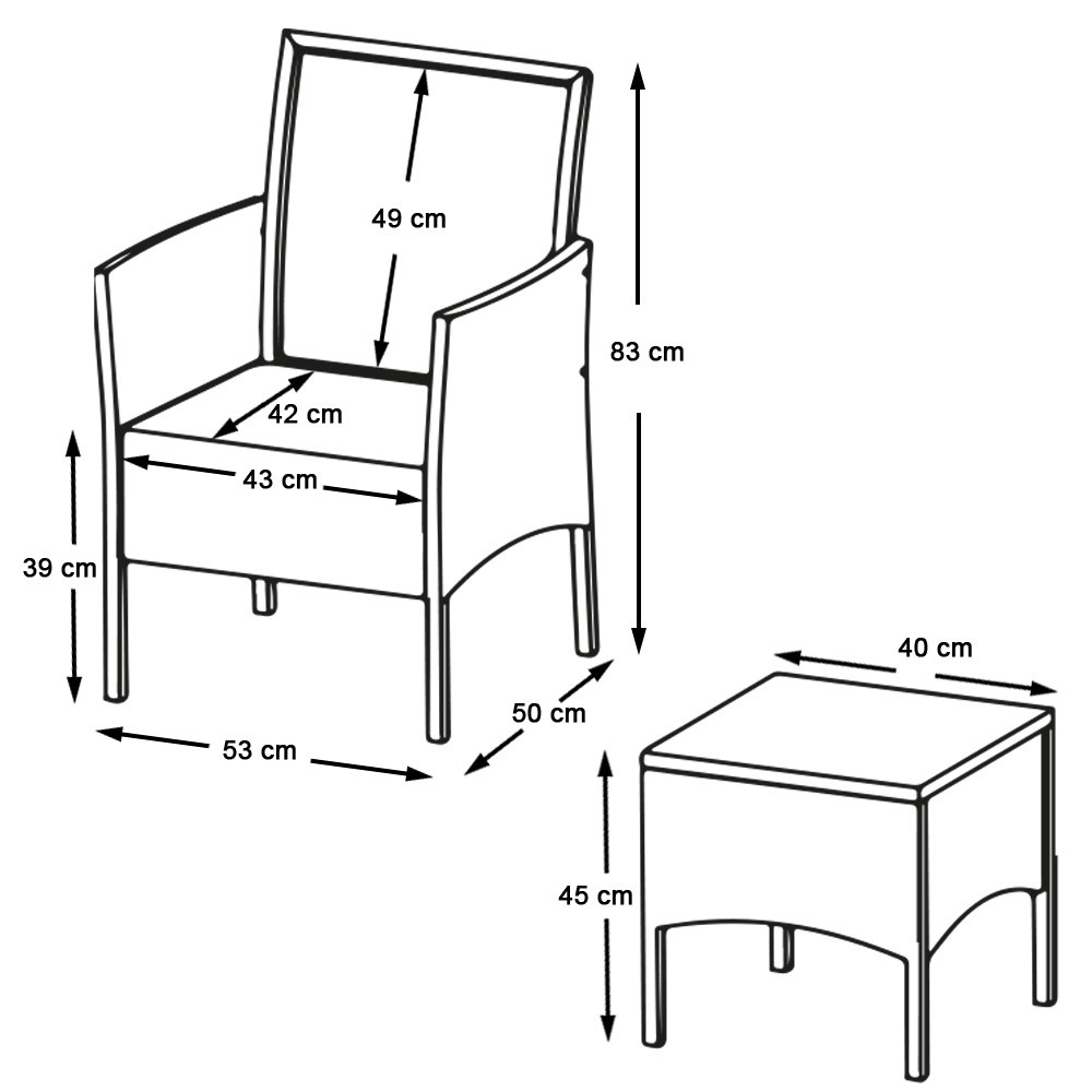 Благодарение на компактните си размери, този комплект е отличен избор за по-малки тераси и балкони. Столовете измерват 53x83x50 см, което ги прави удобни и спестяващи пространство, докато размерът на масата от 40x40x45 см осигурява достатъчно място без пренаселване на зоната.